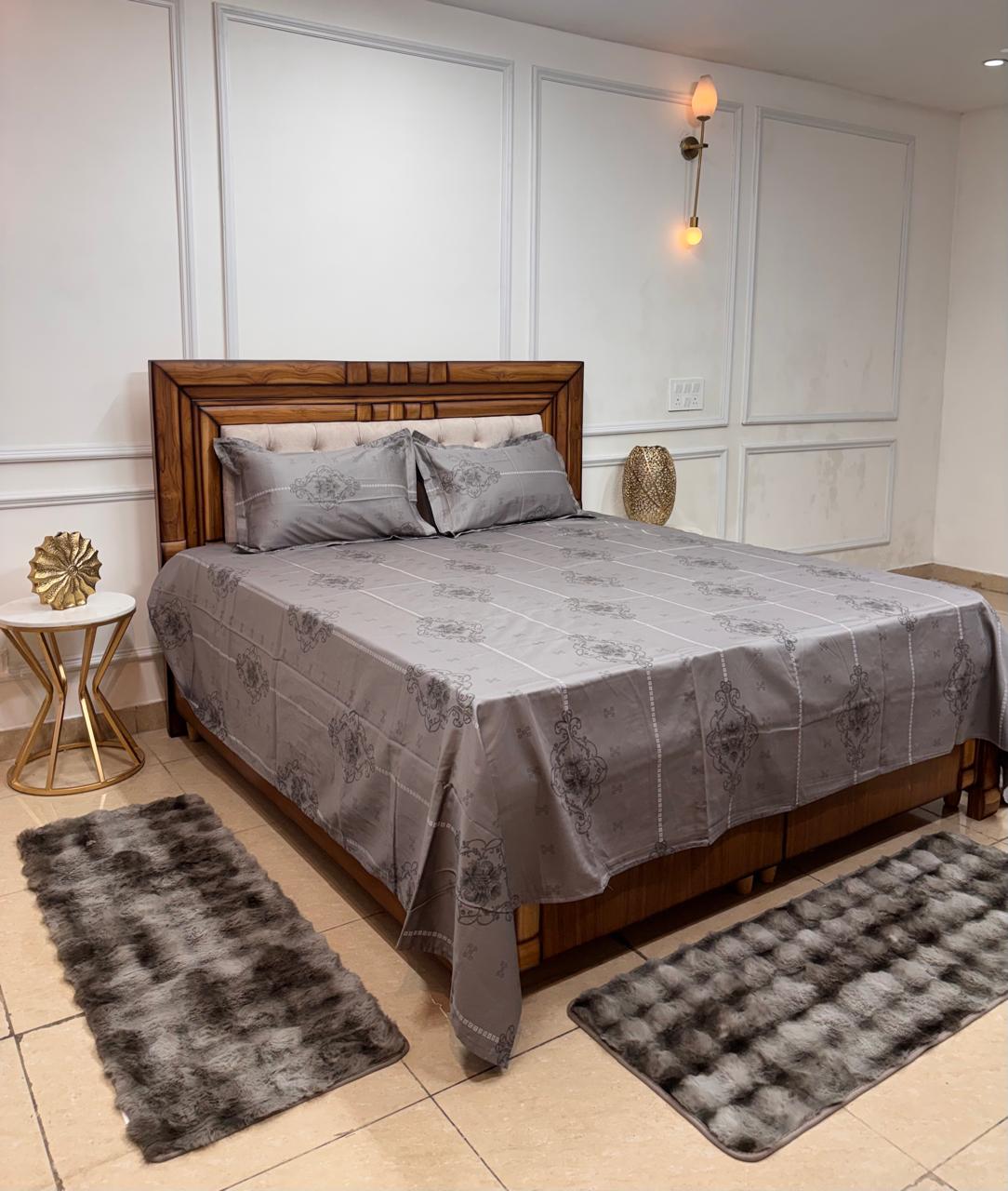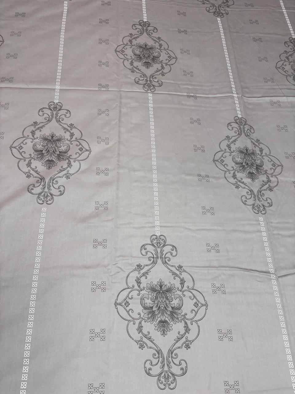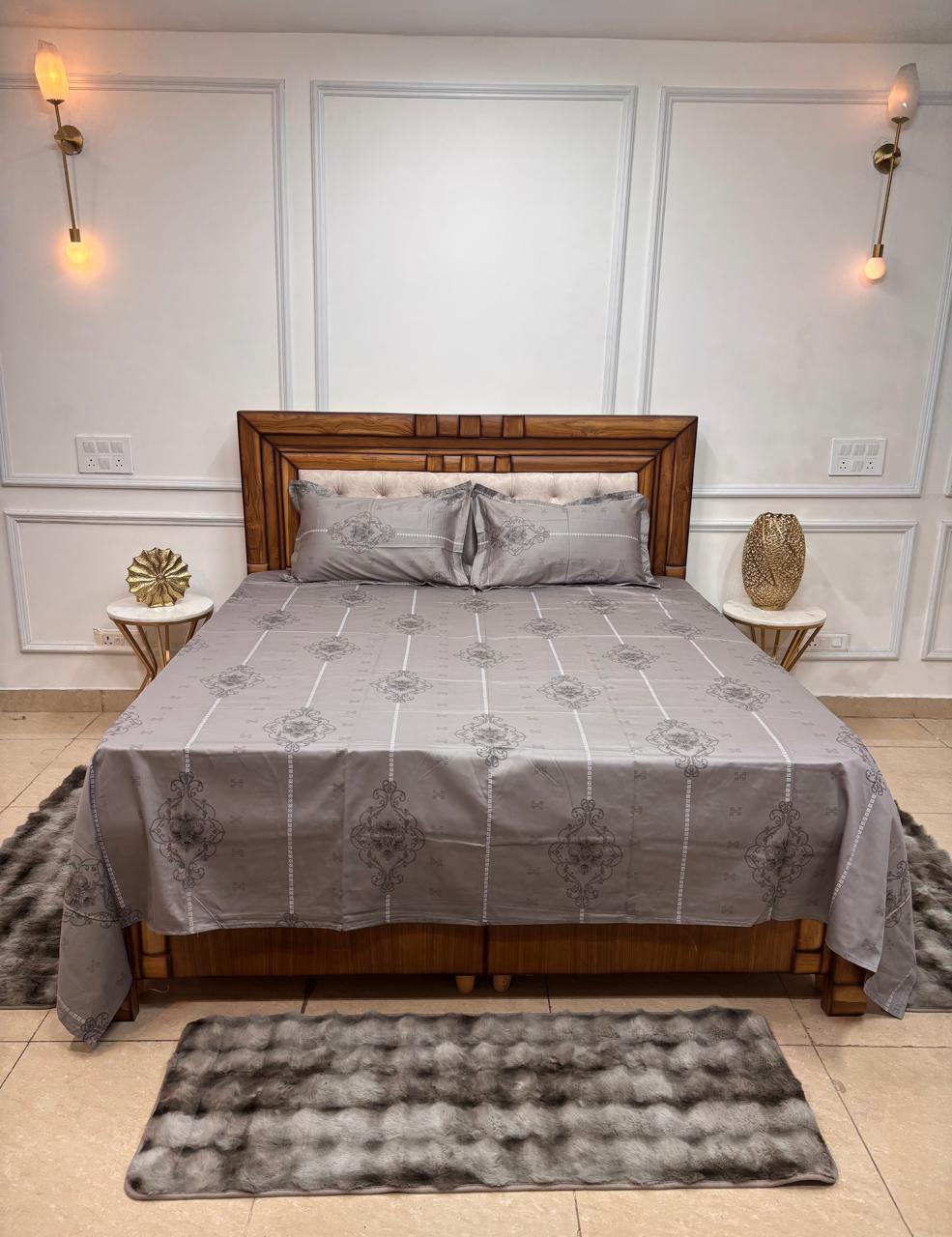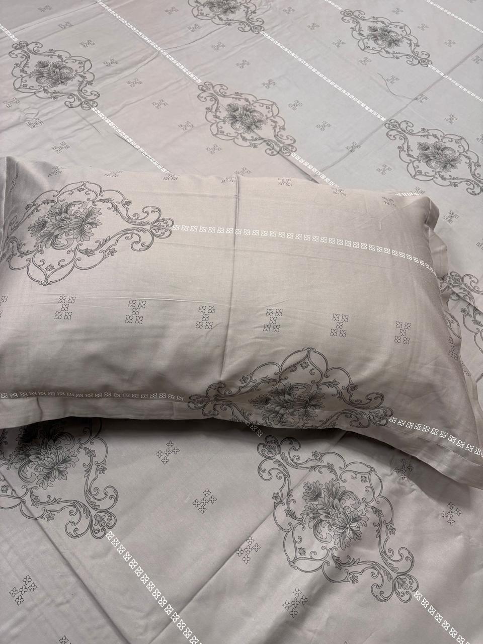 Bring a sense of refined structure and timeless grace to your bedroom with our Silver Medallion Grid Bedsheet. This set features a clean, geometric layout balanced by ornate classical motifs, making it a sophisticated choice for those who appreciate modern symmetry with a traditional touch.