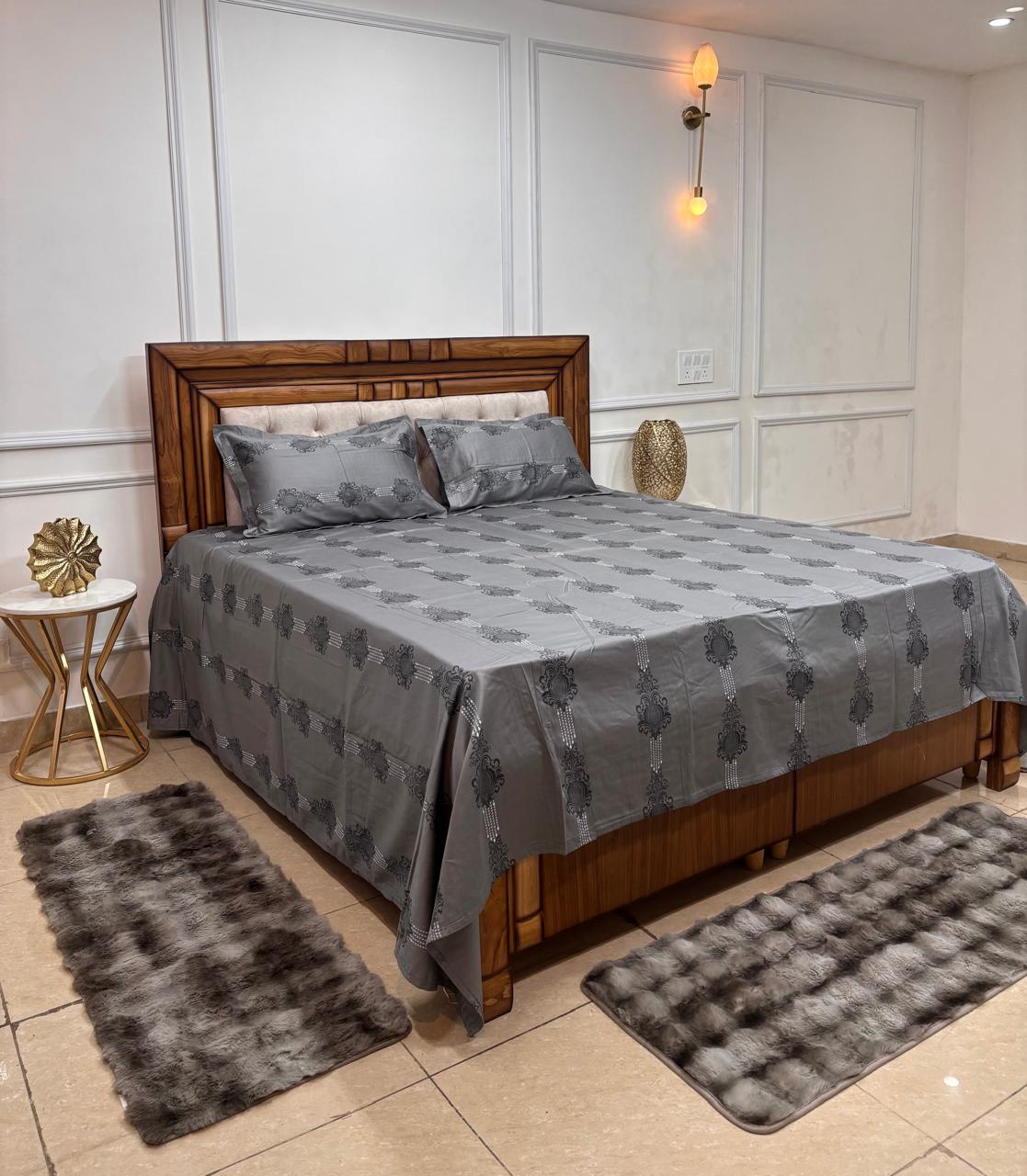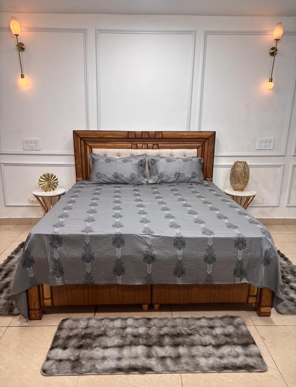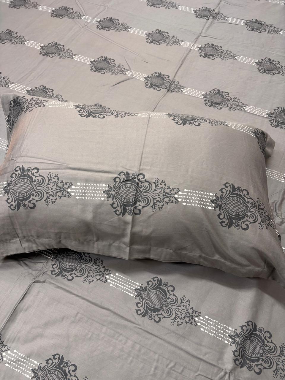 Create a calm and sophisticated bedroom setting with this beautifully styled bedsheet in soothing grey tones. Designed with subtle ornamental patterns, it brings a modern yet timeless appeal to your space. The balanced design and refined colour palette make it easy to pair with any décor.