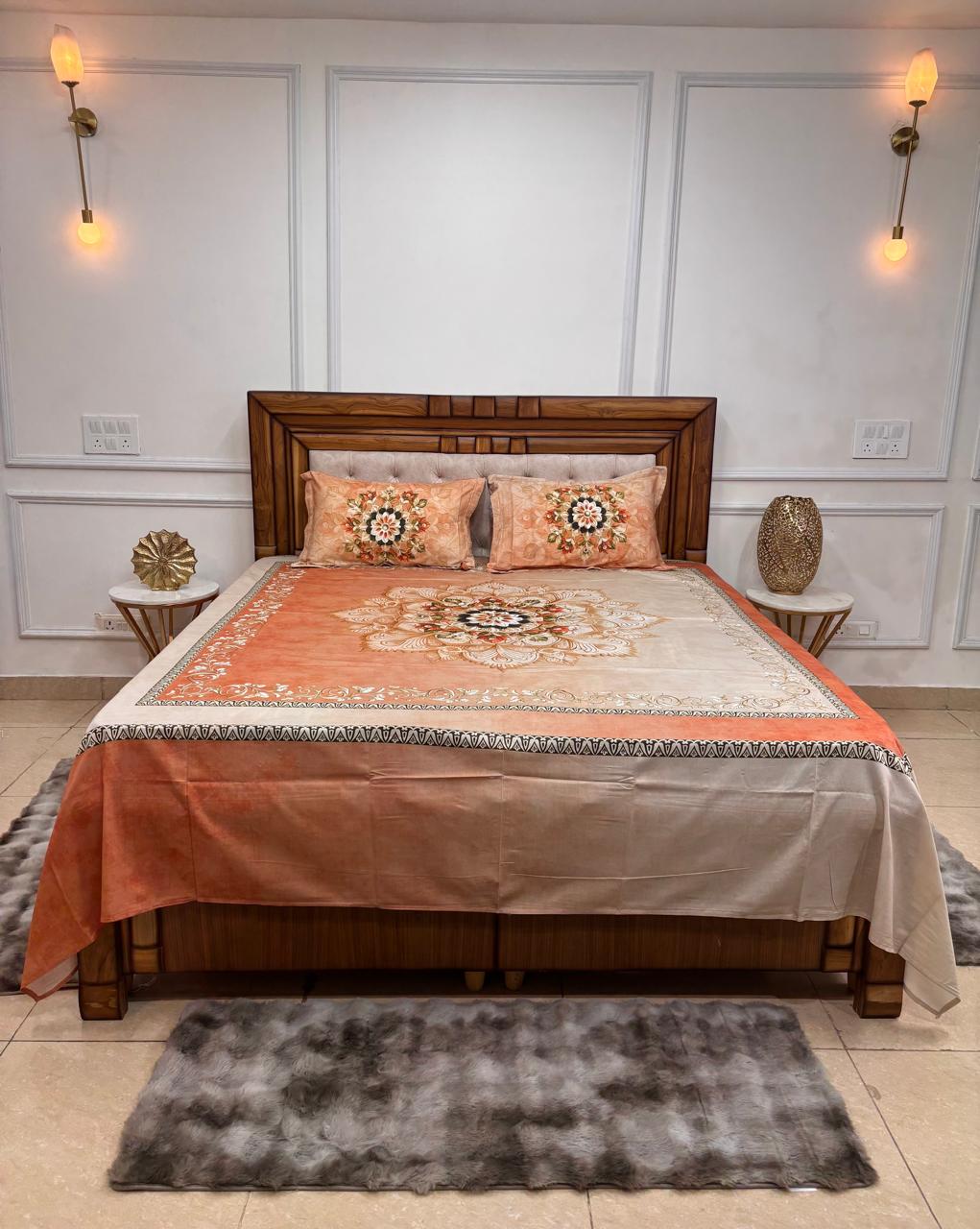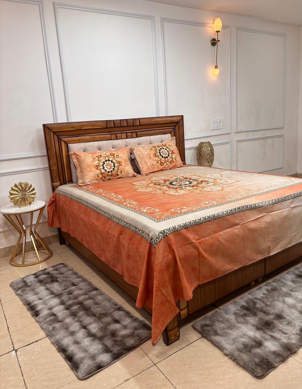 Radiate warmth and artistry in your bedroom with our Sun-Kissed Mandala Ombré Bedsheet. This set features a vibrant horizontal color transition and a grand central medallion, perfectly blending modern gradient techniques with timeless spiritual motifs.