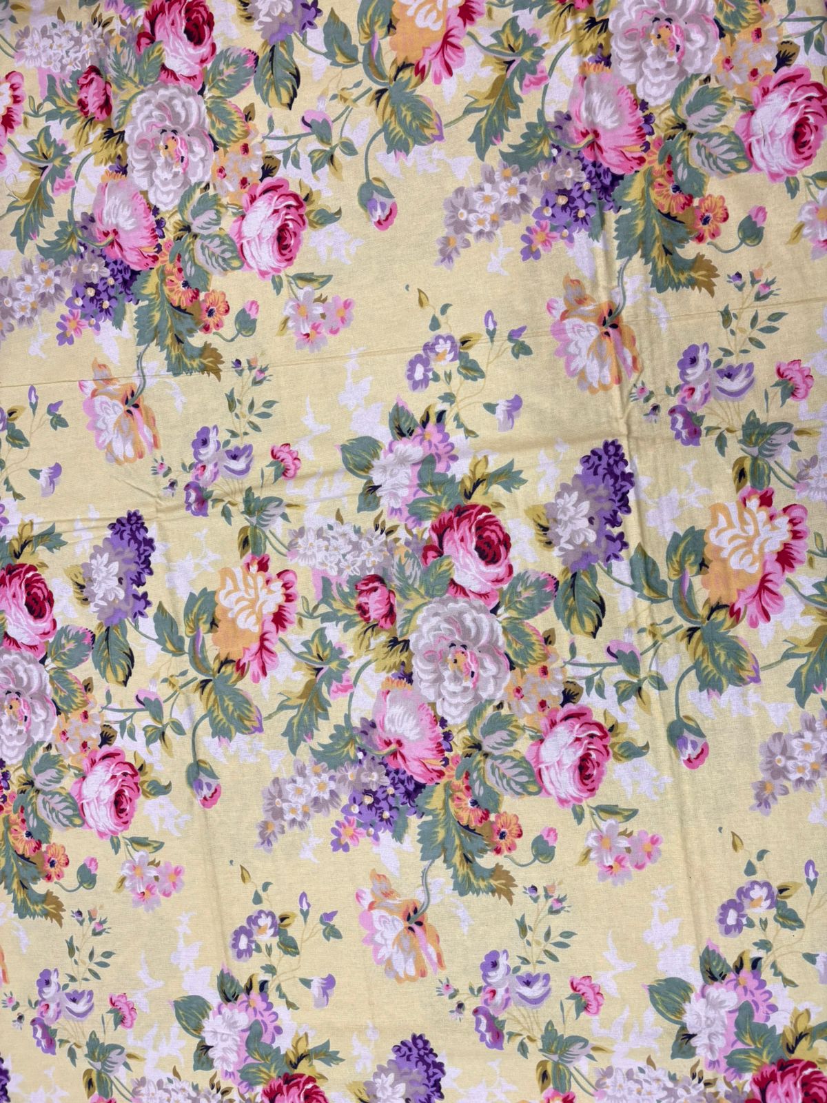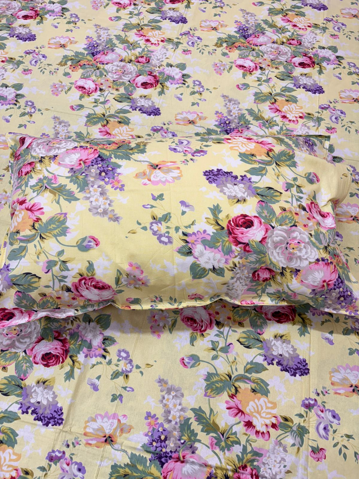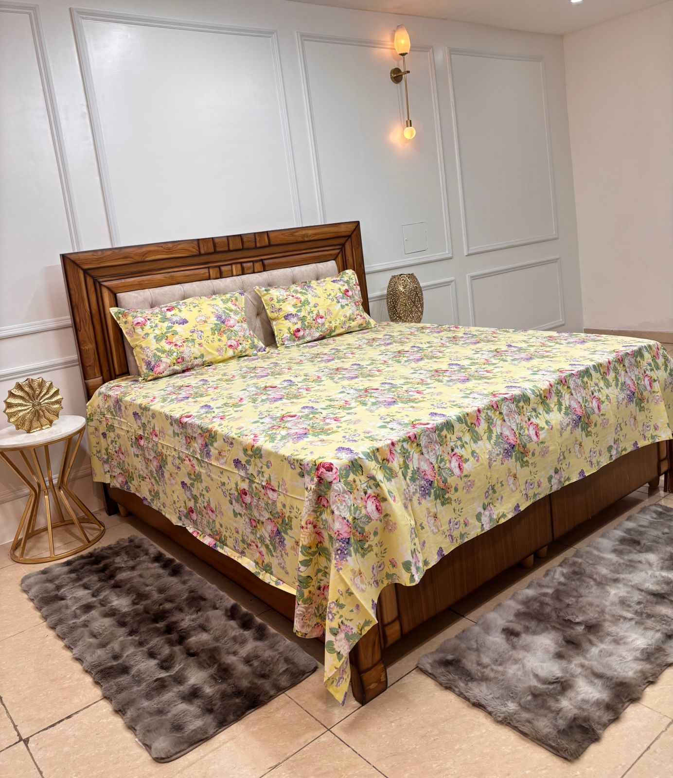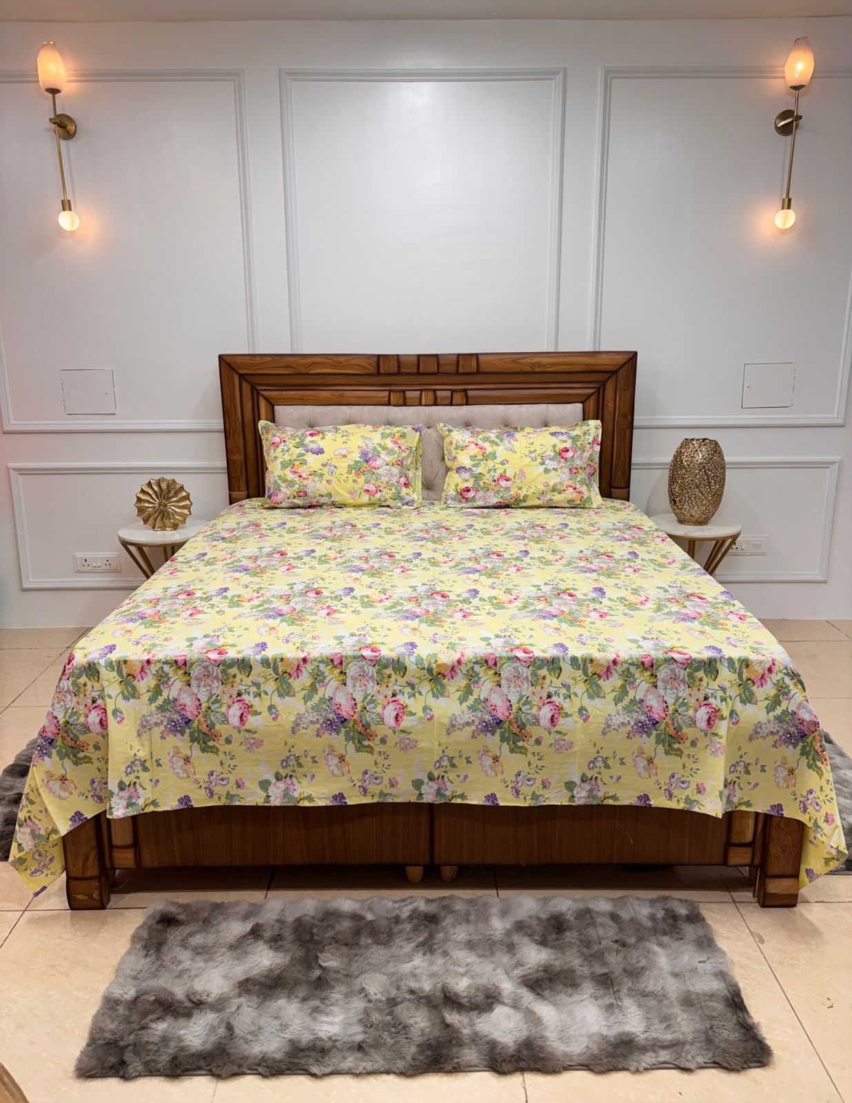 Brighten up your bedroom with the cheerful charm of this yellow floral bedsheet. Designed on a soft pastel yellow base, the delicate multicolour floral print adds a fresh and lively touch to your space. Made from smooth, breathable cotton fabric, this bedsheet offers lasting comfort and a soft feel against the skin.