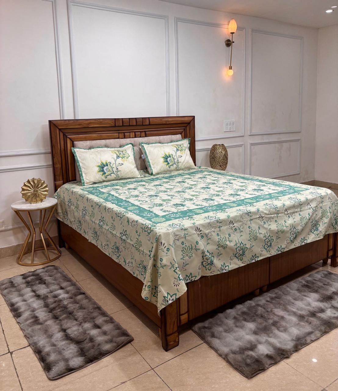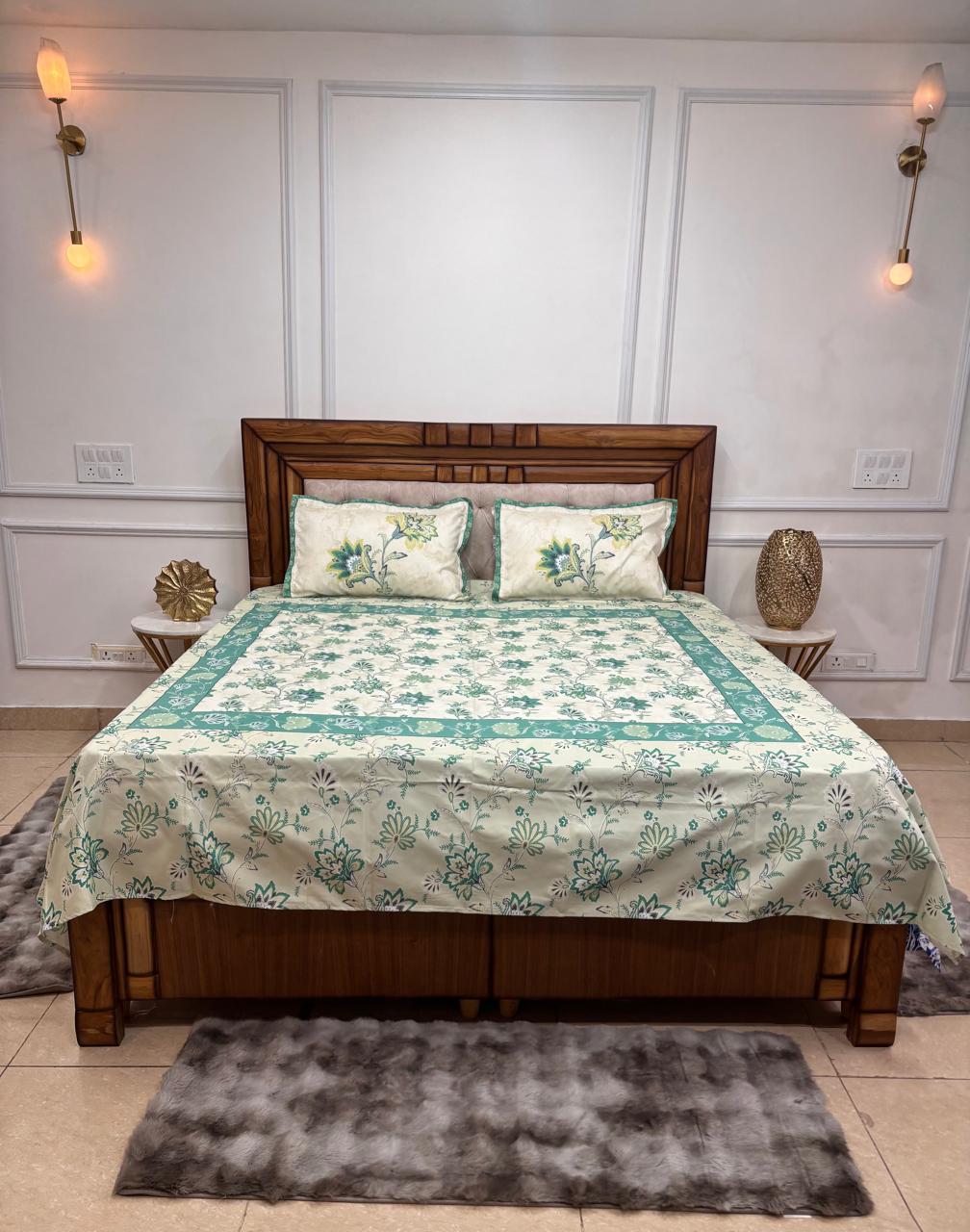Transform your sleep space into a tranquil botanical sanctuary with our Teal Blossom Framed Bedsheet. This set masterfully balances the clean lines of modern architecture with the soft, flowing beauty of traditional floral artistry.