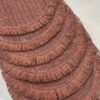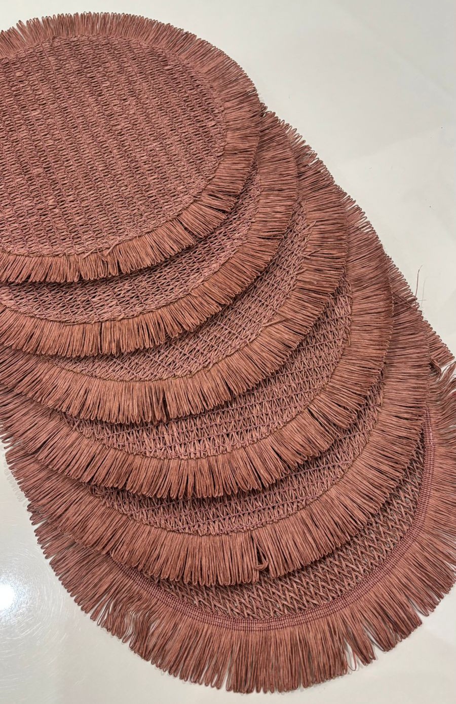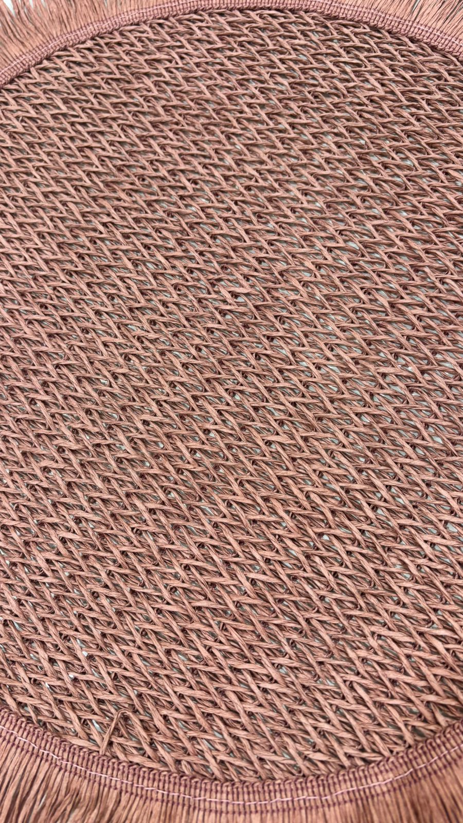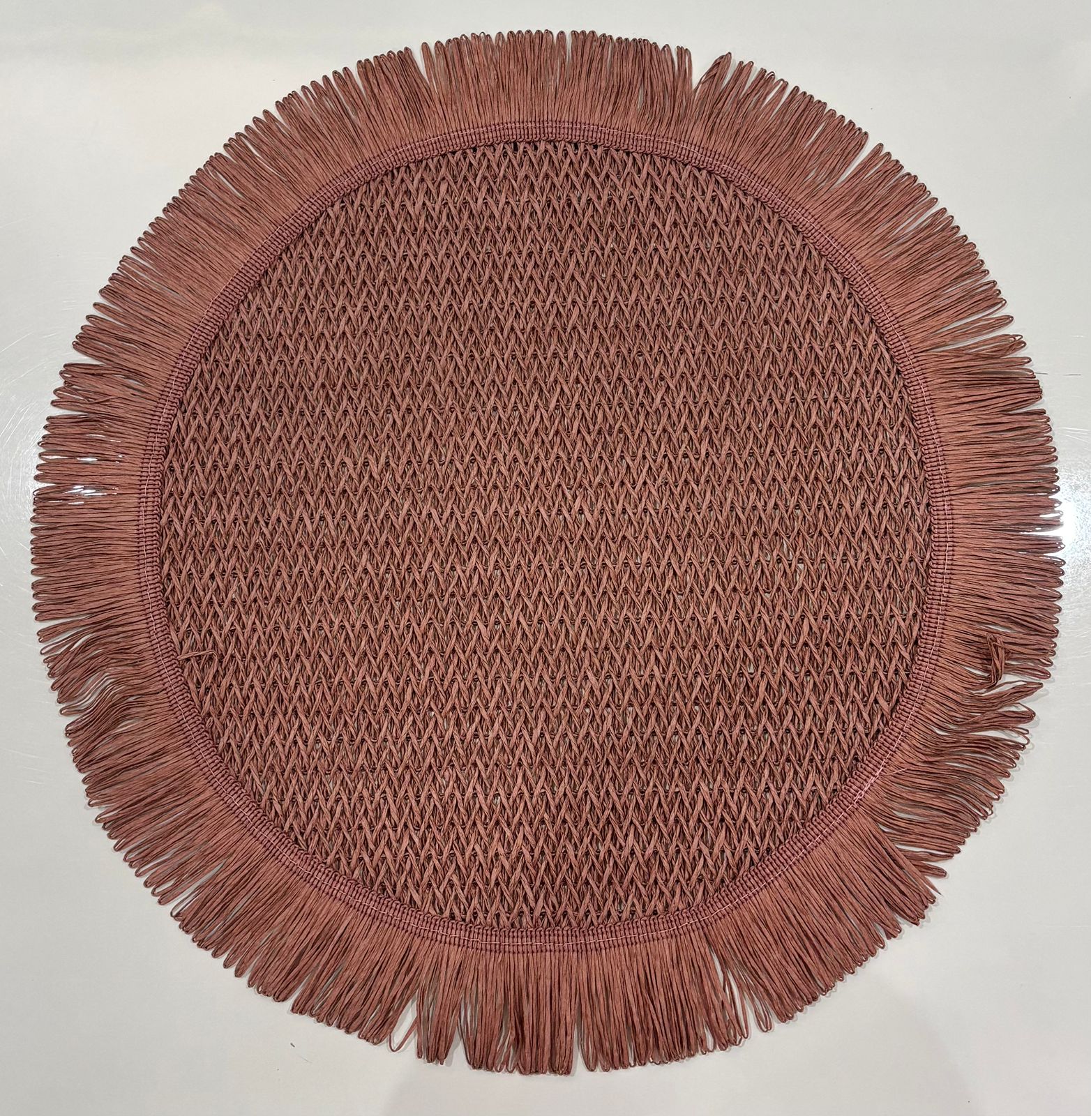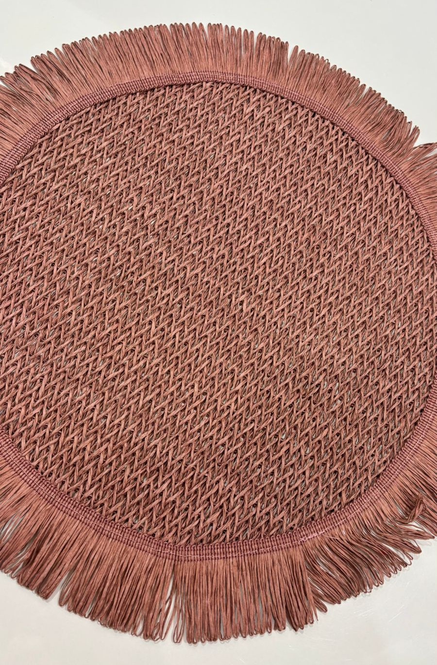Infuse your dining area with warmth using this terracotta rose placemat, which features a rich, earthy pink tone reminiscent of a Mediterranean sunset. The mat is constructed with a complex diagonal weave that offers a tactile, high-quality feel and excellent durability for daily use. A playful and wide looped fringe border adds a whimsical bohemian flair, making it a standout decorative piece for eclectic or coastal interiors.