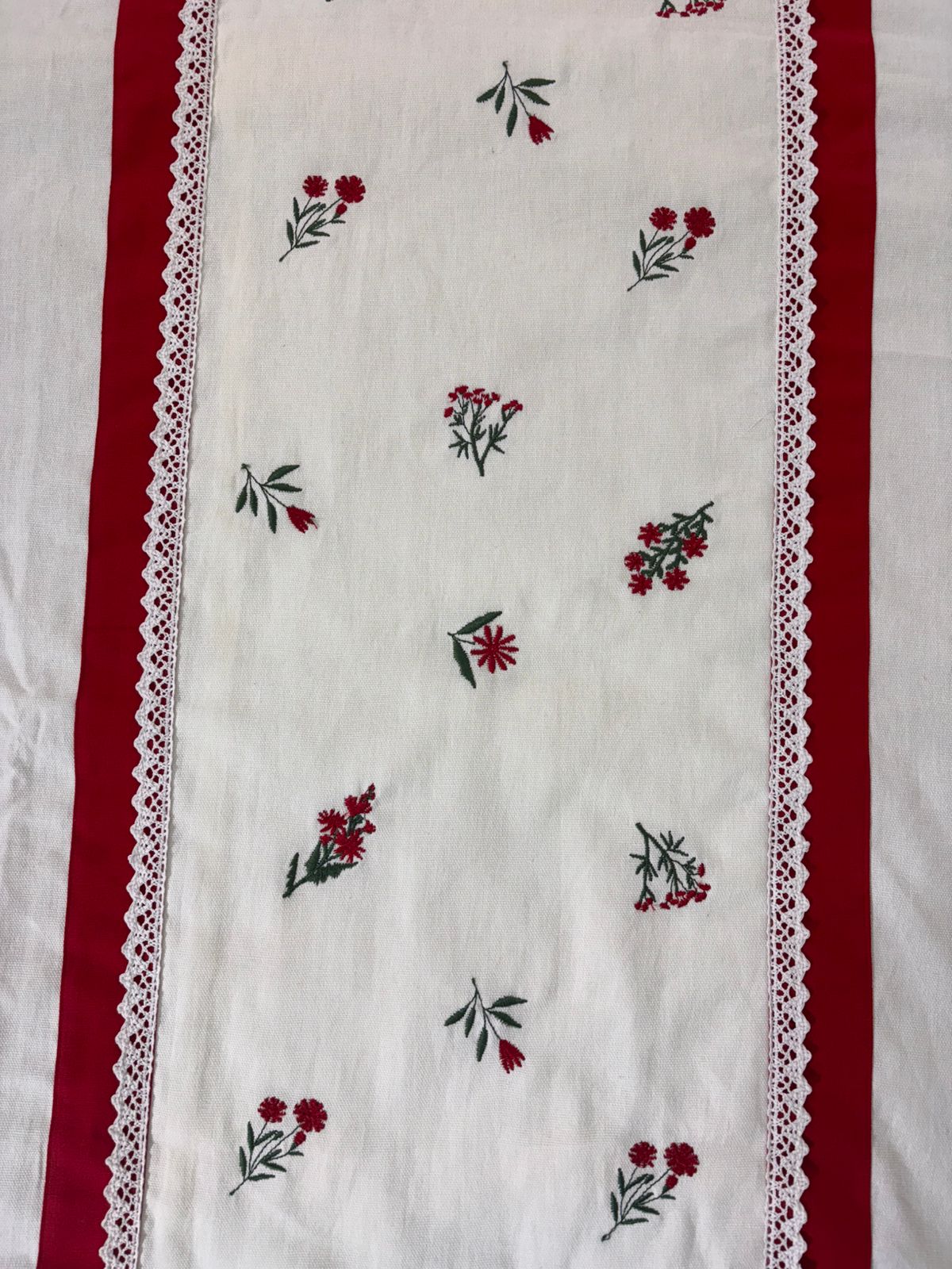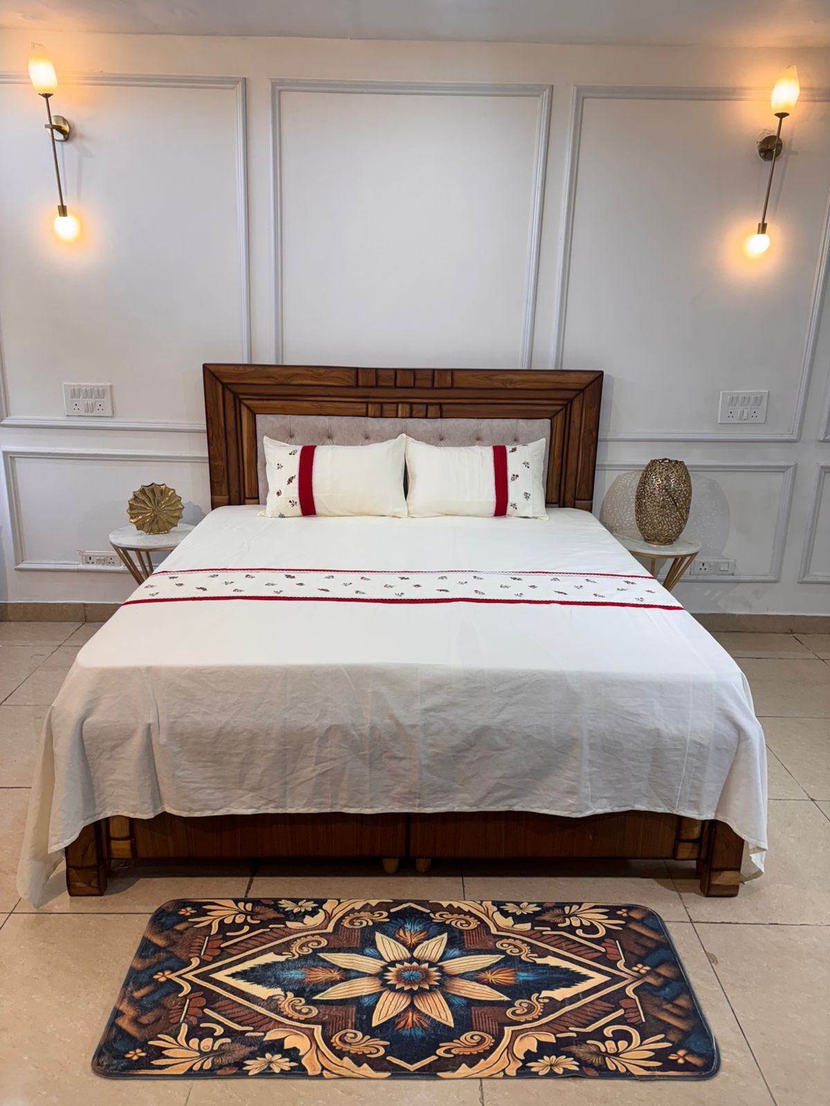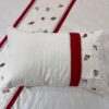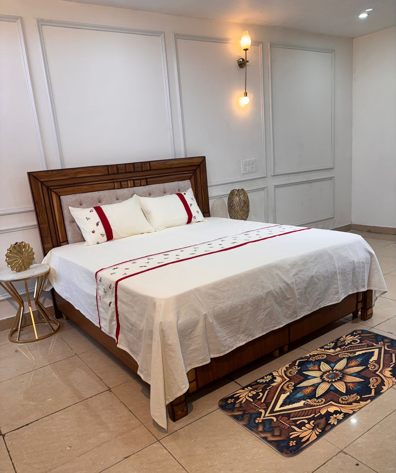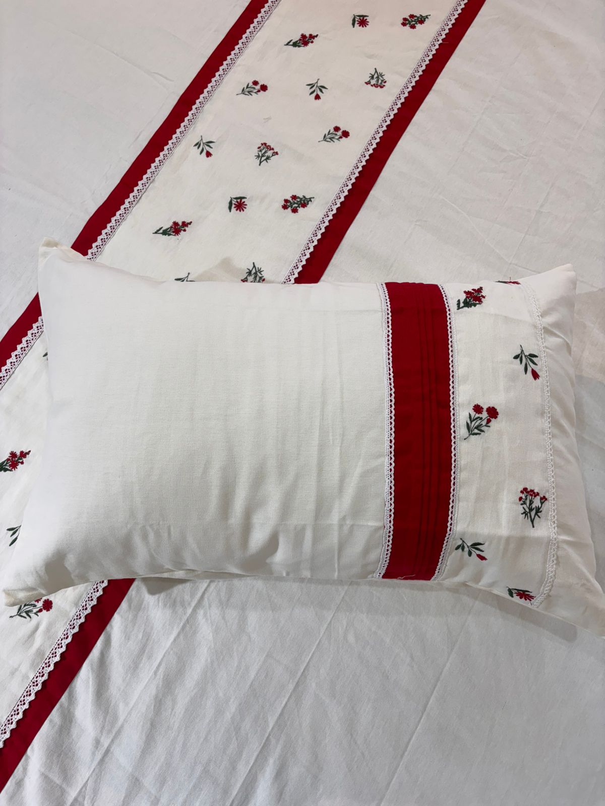 Achieve a look of refined, modern luxury with our Scarlet Grace Embroidered Bedsheet. This set features a pristine cream base that serves as a calm, sophisticated canvas for bold crimson details. The design is highlighted by a centered horizontal band of red floral embroidery, perfectly complemented by vibrant red vertical panels on the matching pillowcases for a tailored, high-contrast look.