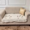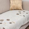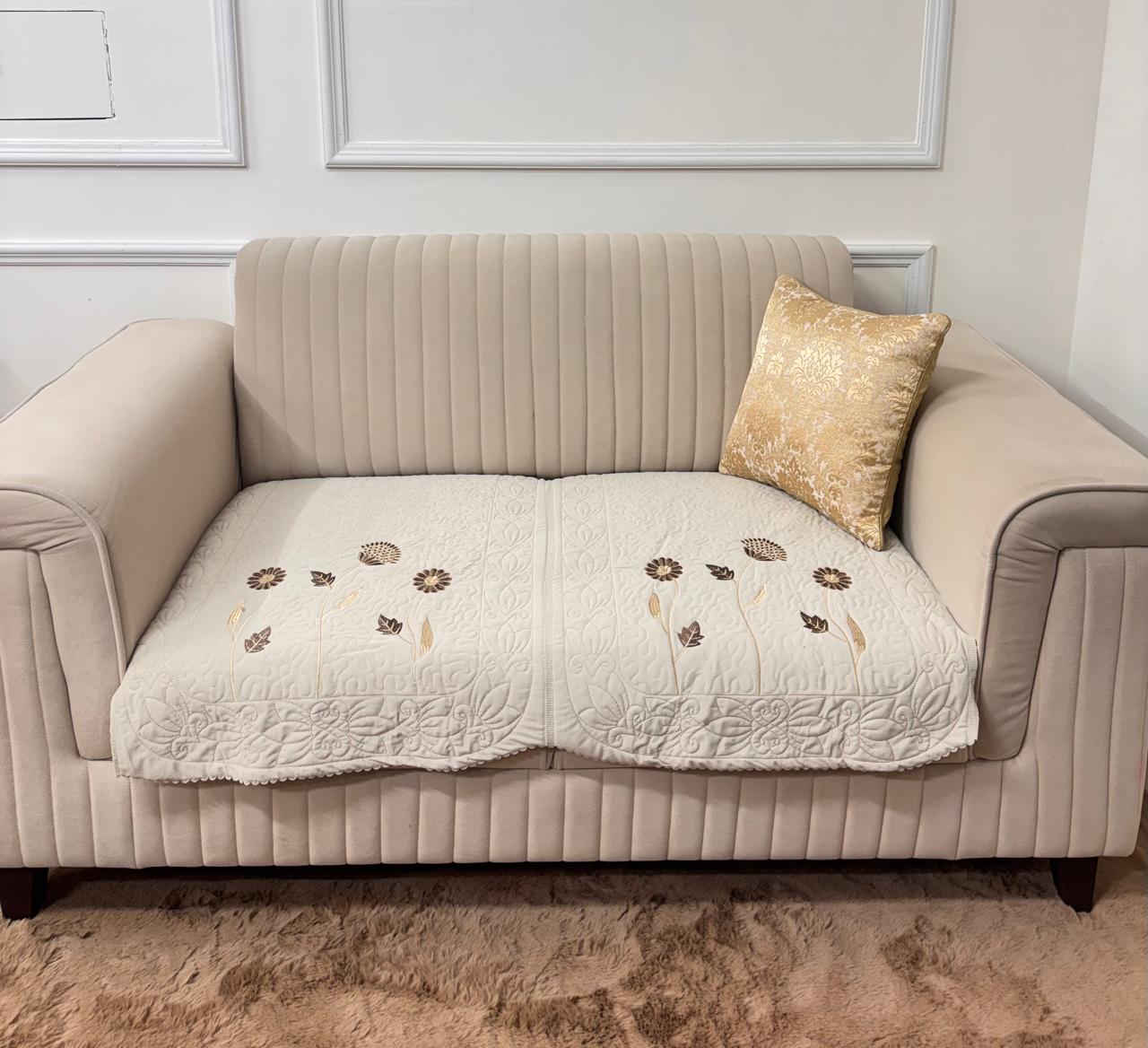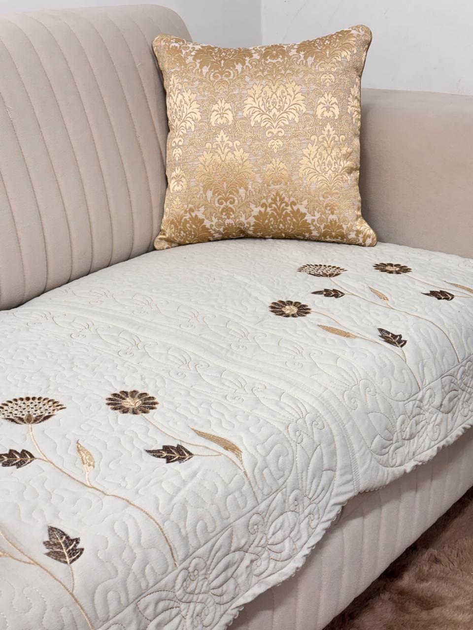 Elevate your living space with this exquisitely crafted quilted sofa cover, designed to blend timeless elegance with practical protection. Featuring a soft, off-white cream base, this cover is adorned with delicate floral embroidery in rich bronze and chocolate tones, creating a sophisticated botanical focal point for your furniture.