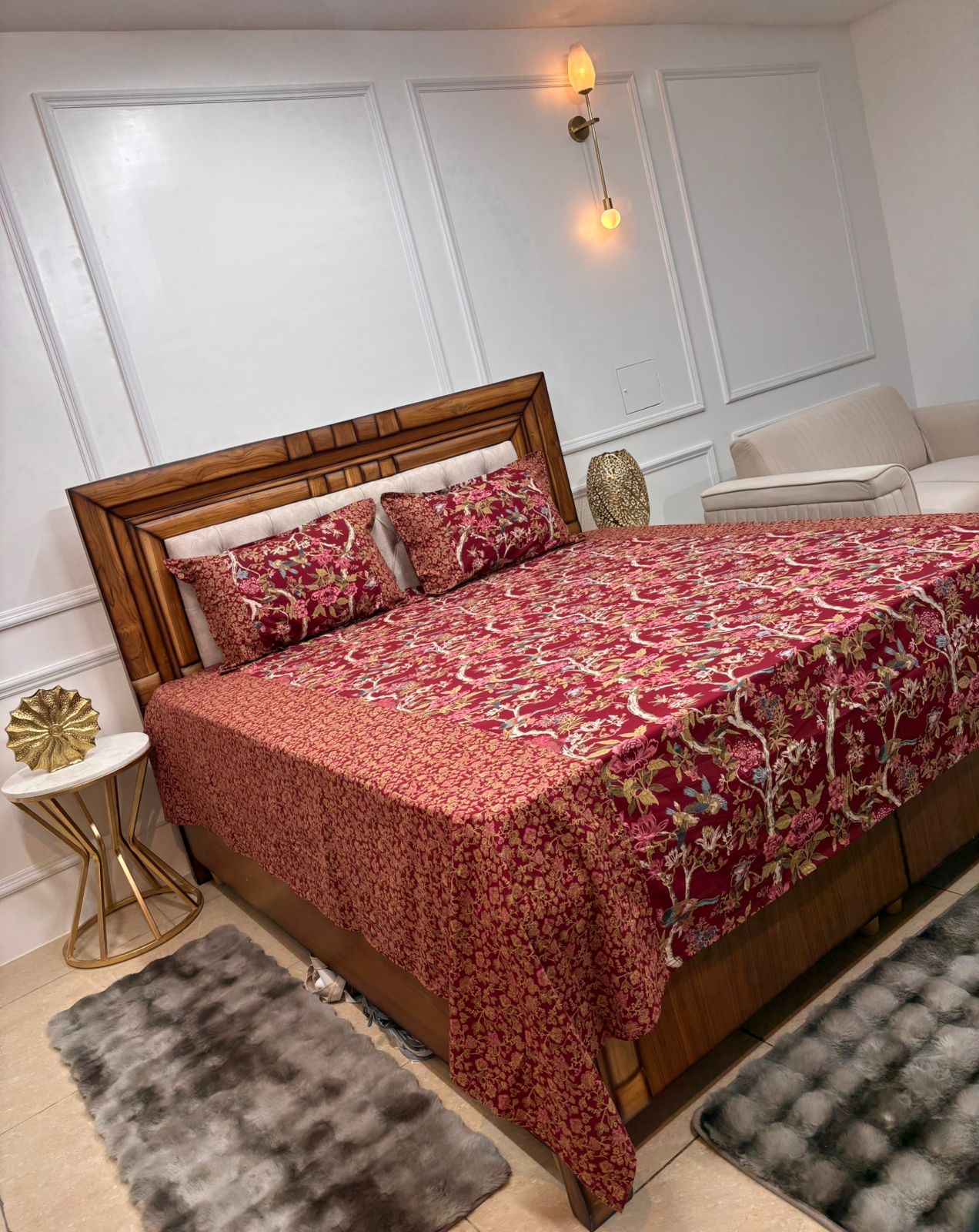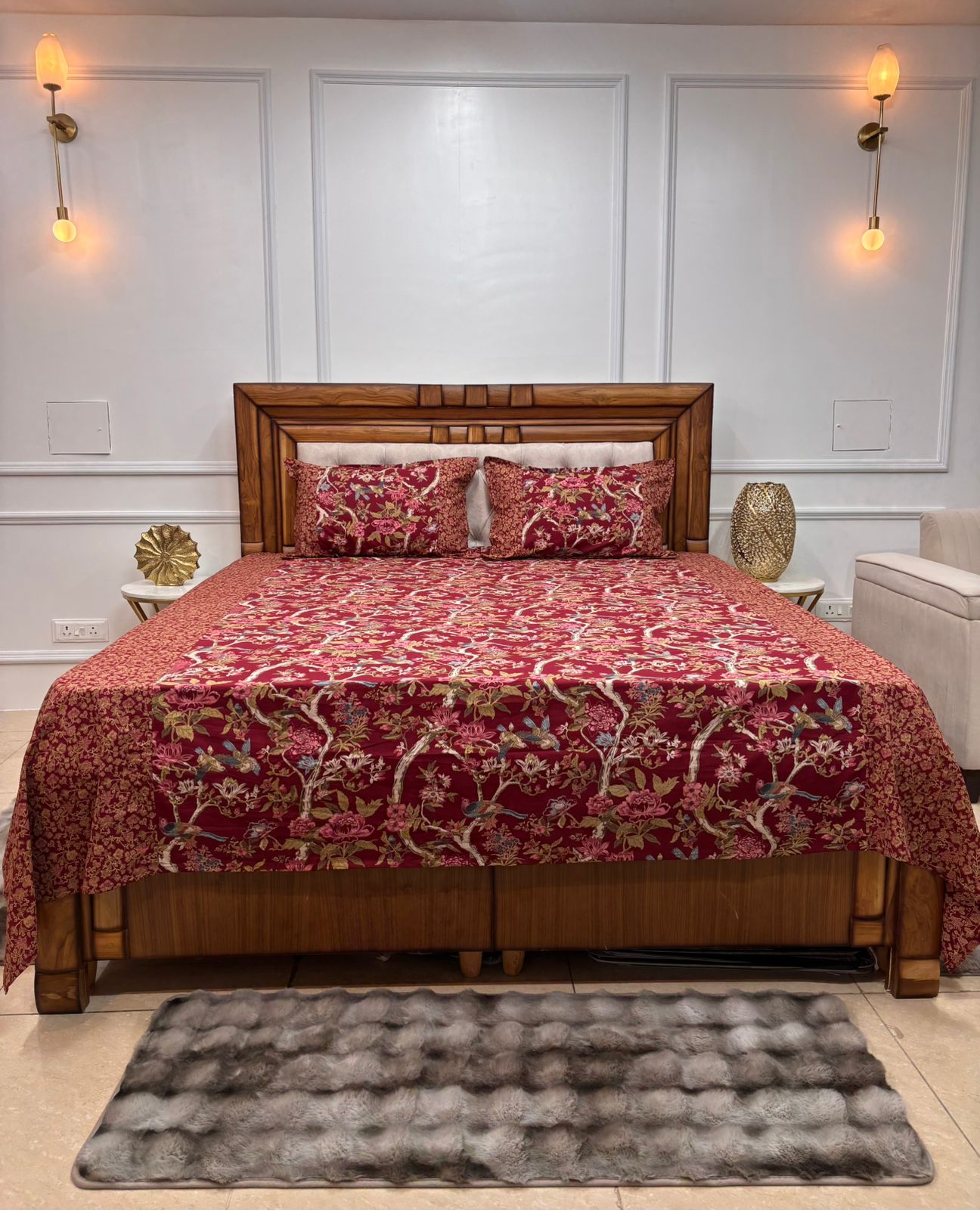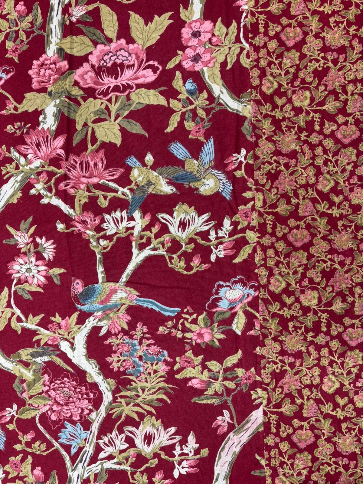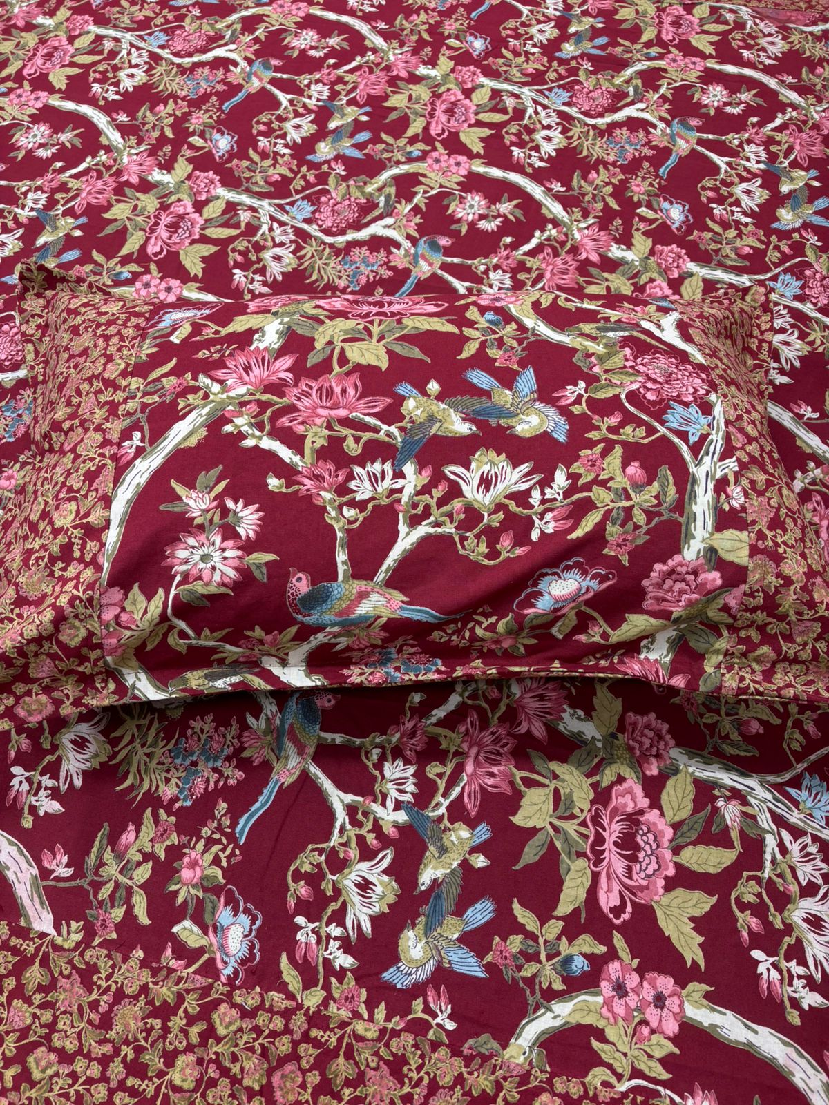 Elevate your sanctuary with the dramatic beauty of the Enchanted Forest collection. This design features a rich, dense tapestry of winding vines, blooming florals, and delicate bird motifs set against deep, jewel-toned backgrounds. Perfectly complemented by a fine-patterned ethnic border, this set is a masterpiece of maximalist elegance.