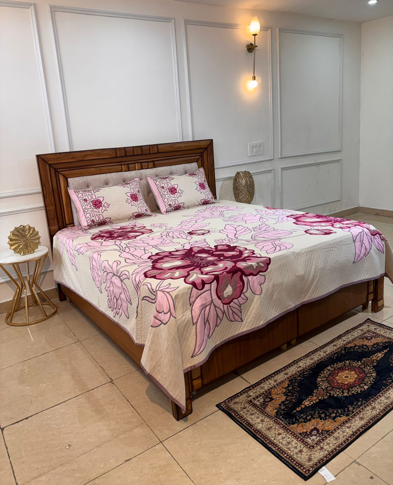 Transform your bedroom into a blooming sanctuary with our stunning Floral Bedcover Set. Featuring a striking contrast of deep magenta and soft blush pink against a clean cream backdrop, this set is designed to be the centerpiece of any master suite.