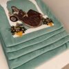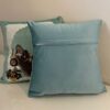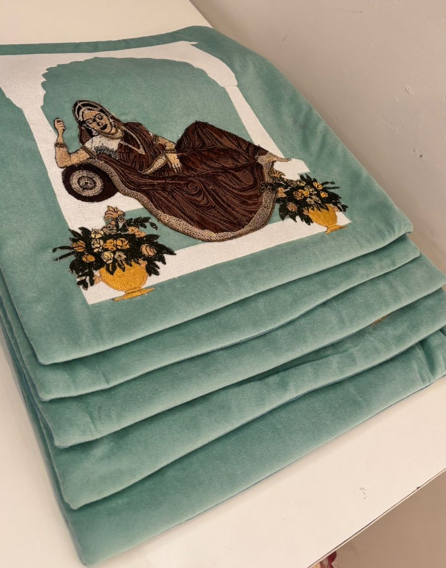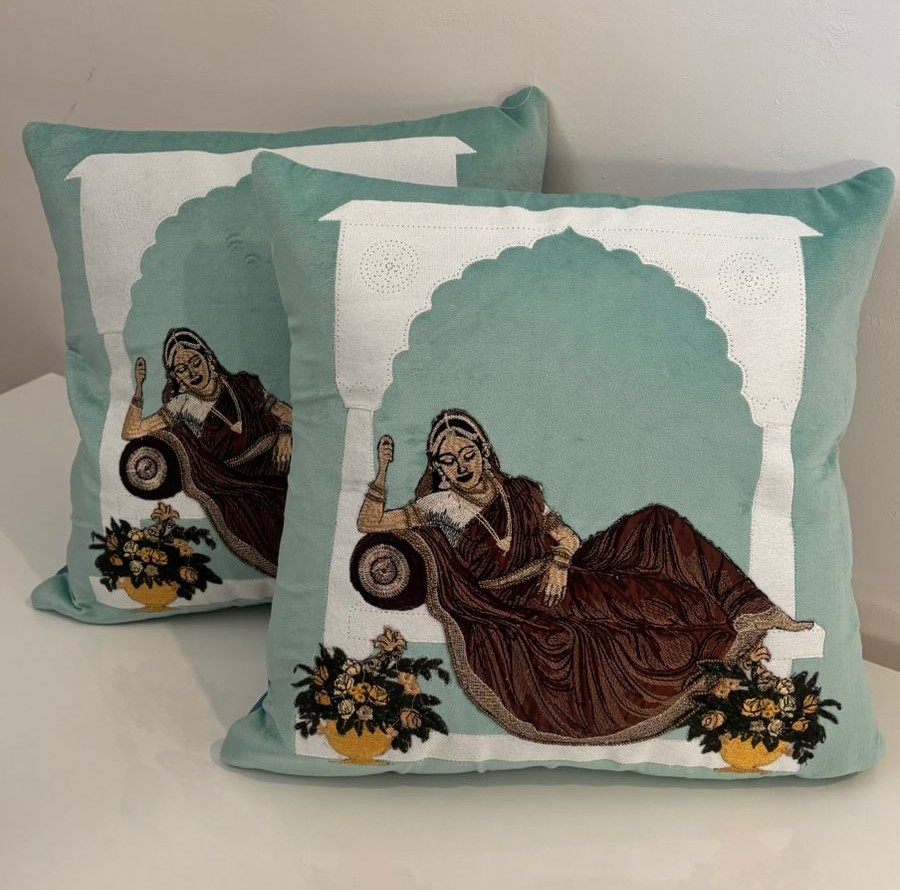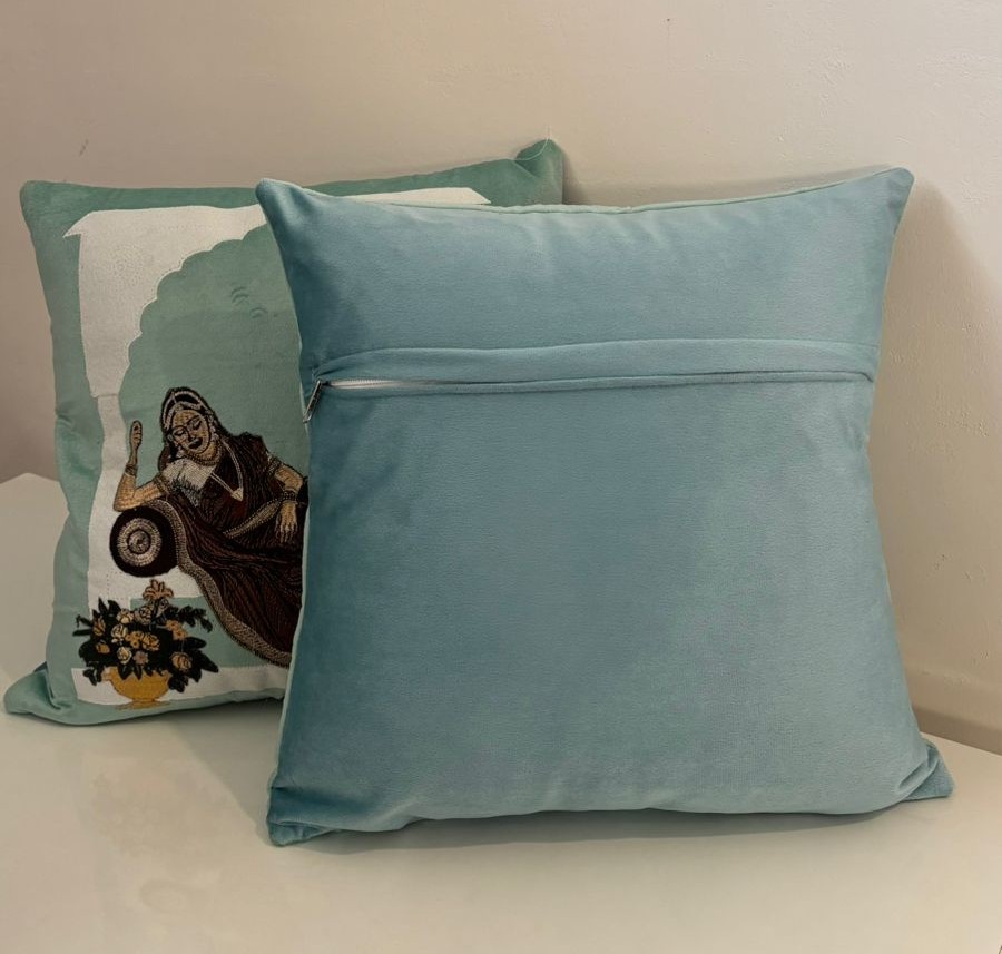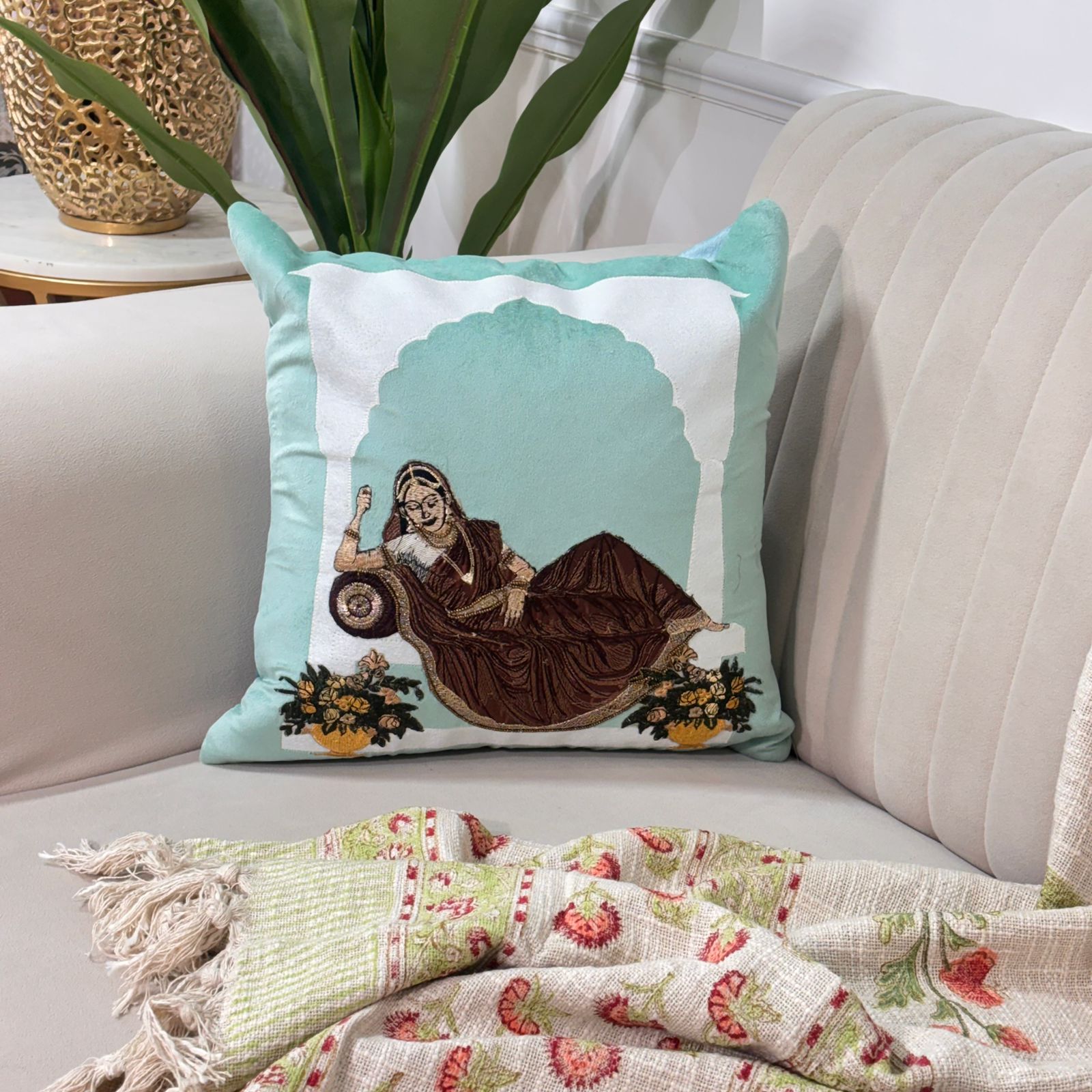 This artistic cushion cover features a graceful heritage-inspired figure beautifully embroidered beneath an elegant arch motif. The soothing sea-green base is enhanced with detailed threadwork in earthy browns, ivory whites, and soft floral accents, creating a calm yet regal presence.
