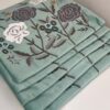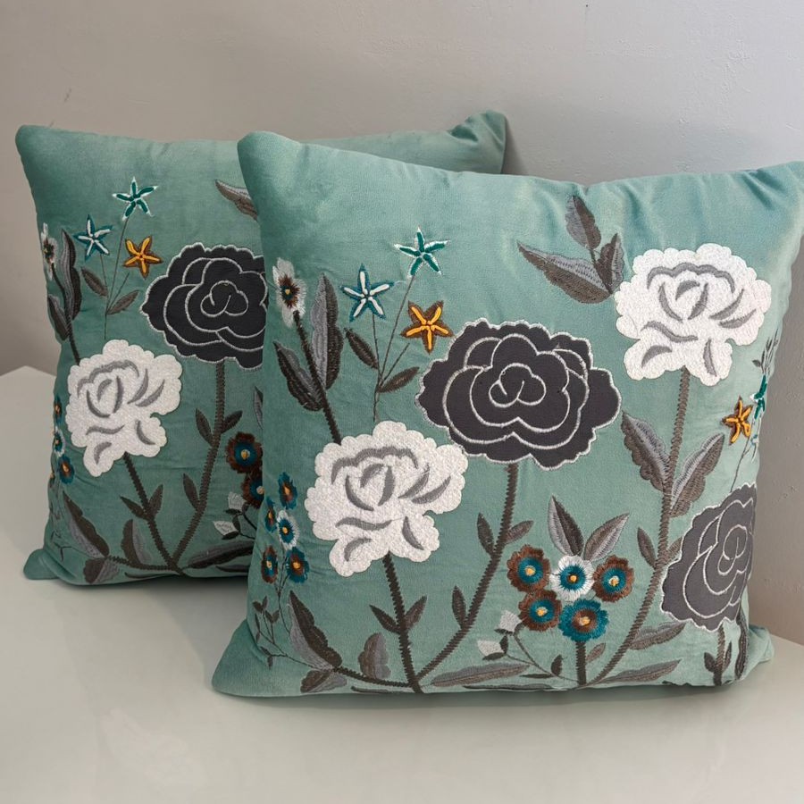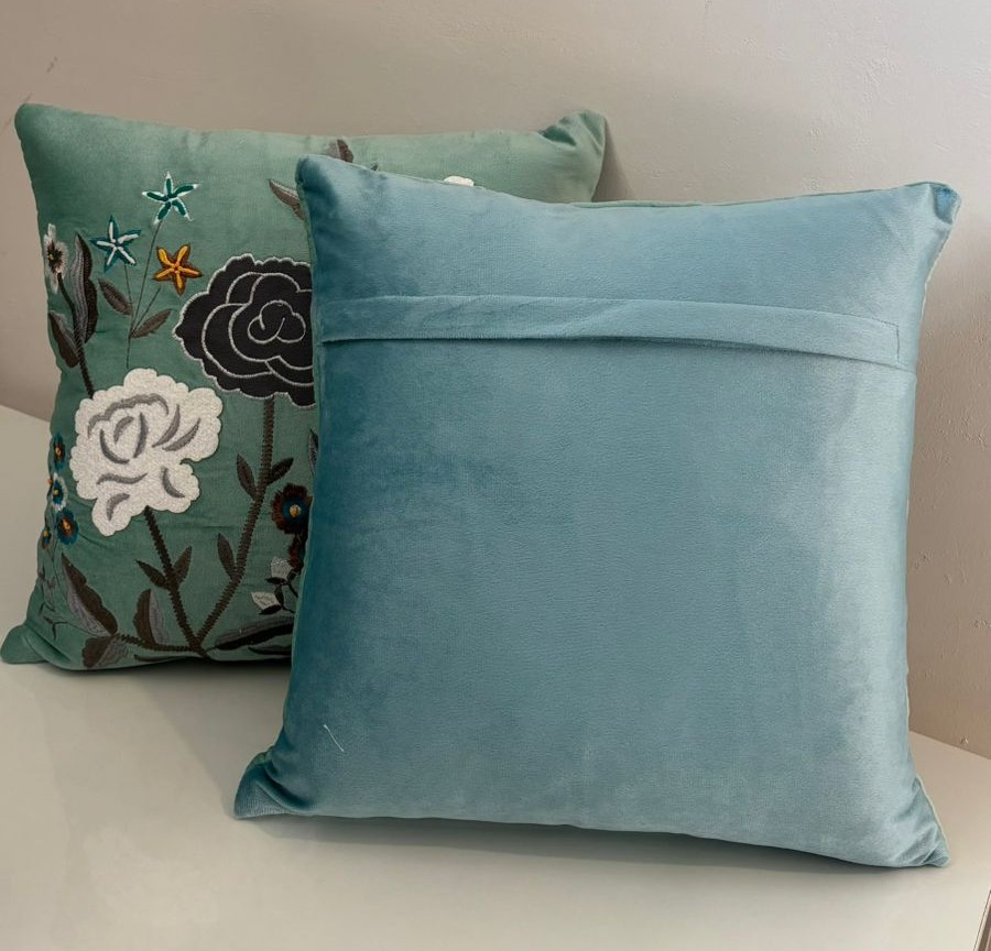 Bring calm elegance to your space with this beautifully embroidered cushion cover. Set on a soothing sage green velvet base, it features detailed floral motifs in white and charcoal grey, highlighted with subtle pops of teal and mustard. The rich velvet fabric adds a soft, luxurious feel, while the intricate embroidery gives it a handcrafted, artistic charm.