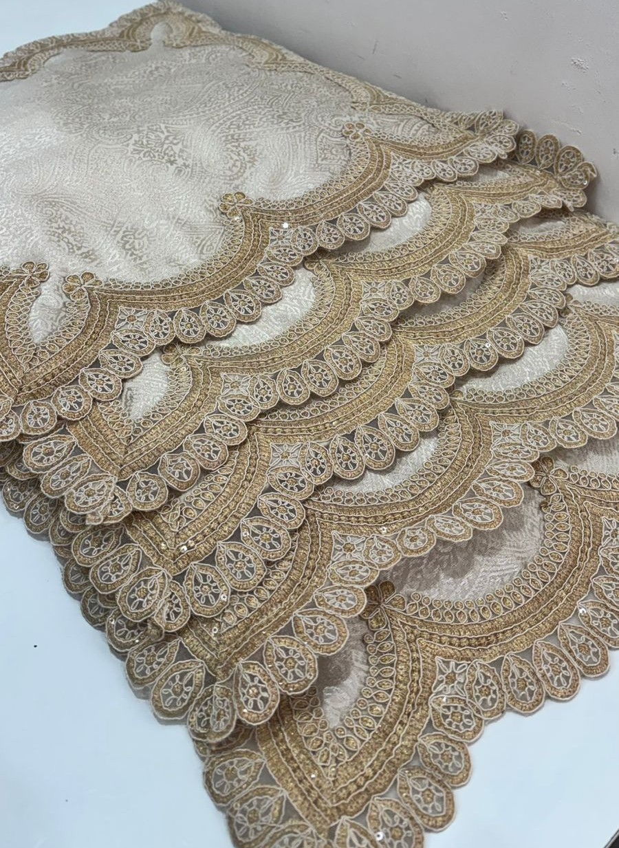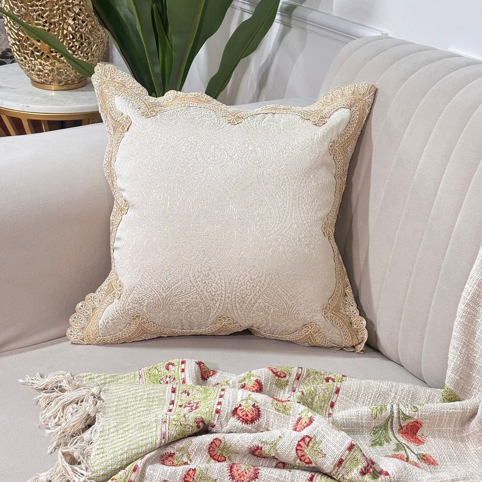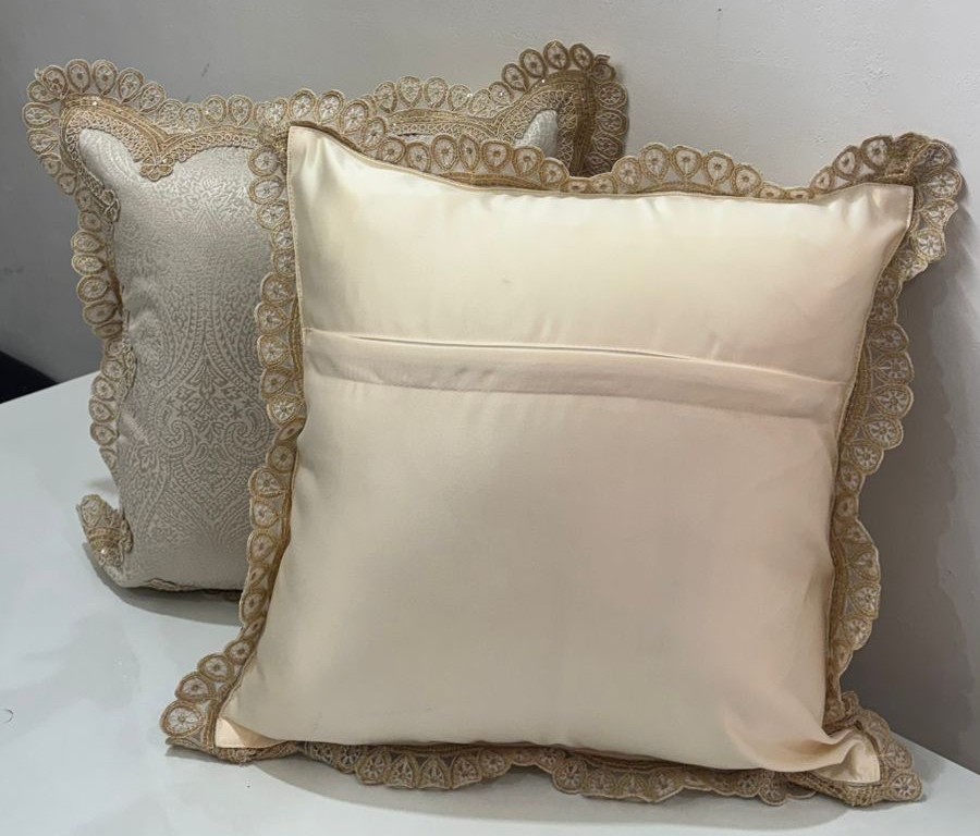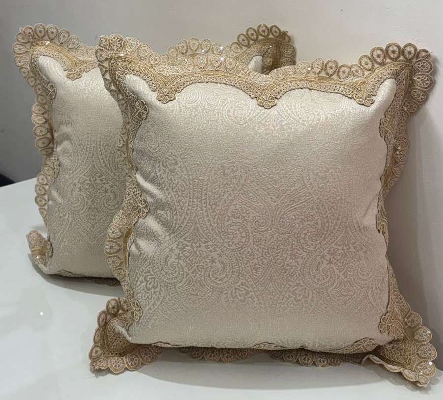 Elevate your décor with this statement cushion cover crafted in a rich earthy taupe-brown tone. The surface showcases a subtle damask-inspired woven pattern, giving the fabric a graceful texture that looks luxurious without being loud. Finished with an ornate ivory lace border, the cushion has a heritage, handcrafted appeal that instantly adds elegance to sofas, beds, or accent chairs.